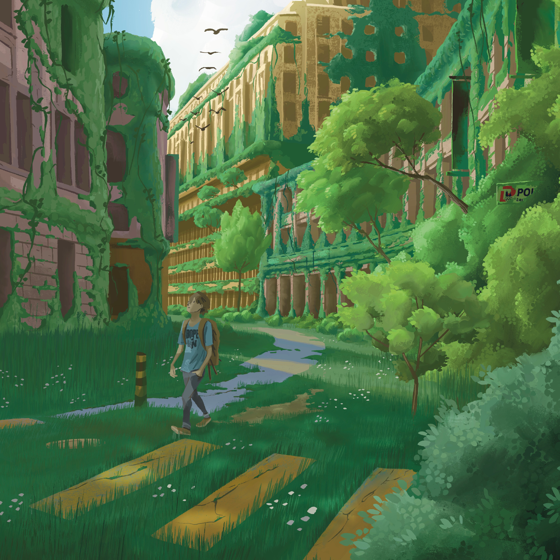 La tour Bel-Air de Lausanne, envahie par la végétation, se dresse paisiblement dans un quartier du Flon abandonné. Un jeune explorateur, sous un soleil éclatant, découvre ce lieu oublié, où nature et silence règnent en maîtres, offrant une quiétude inattendue.