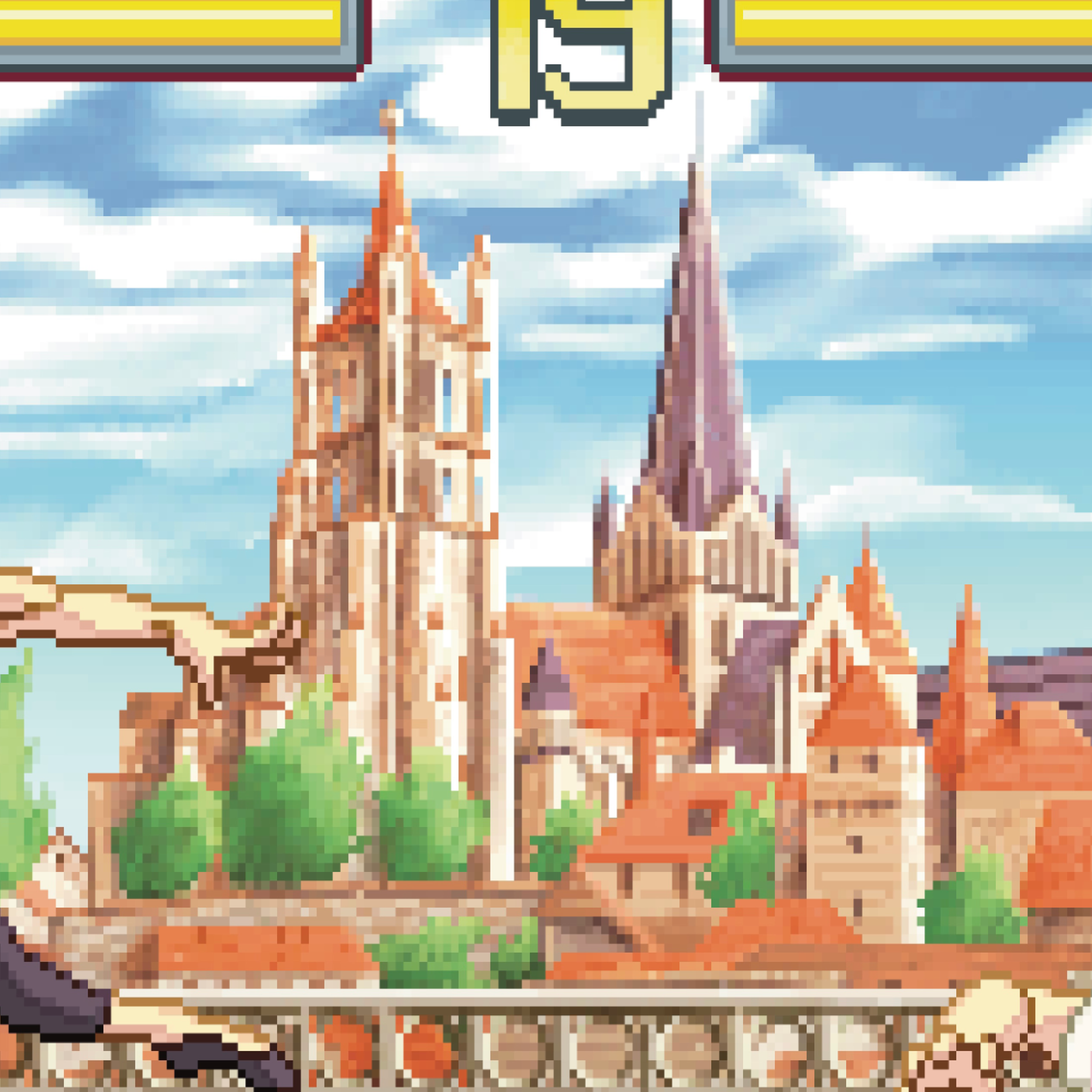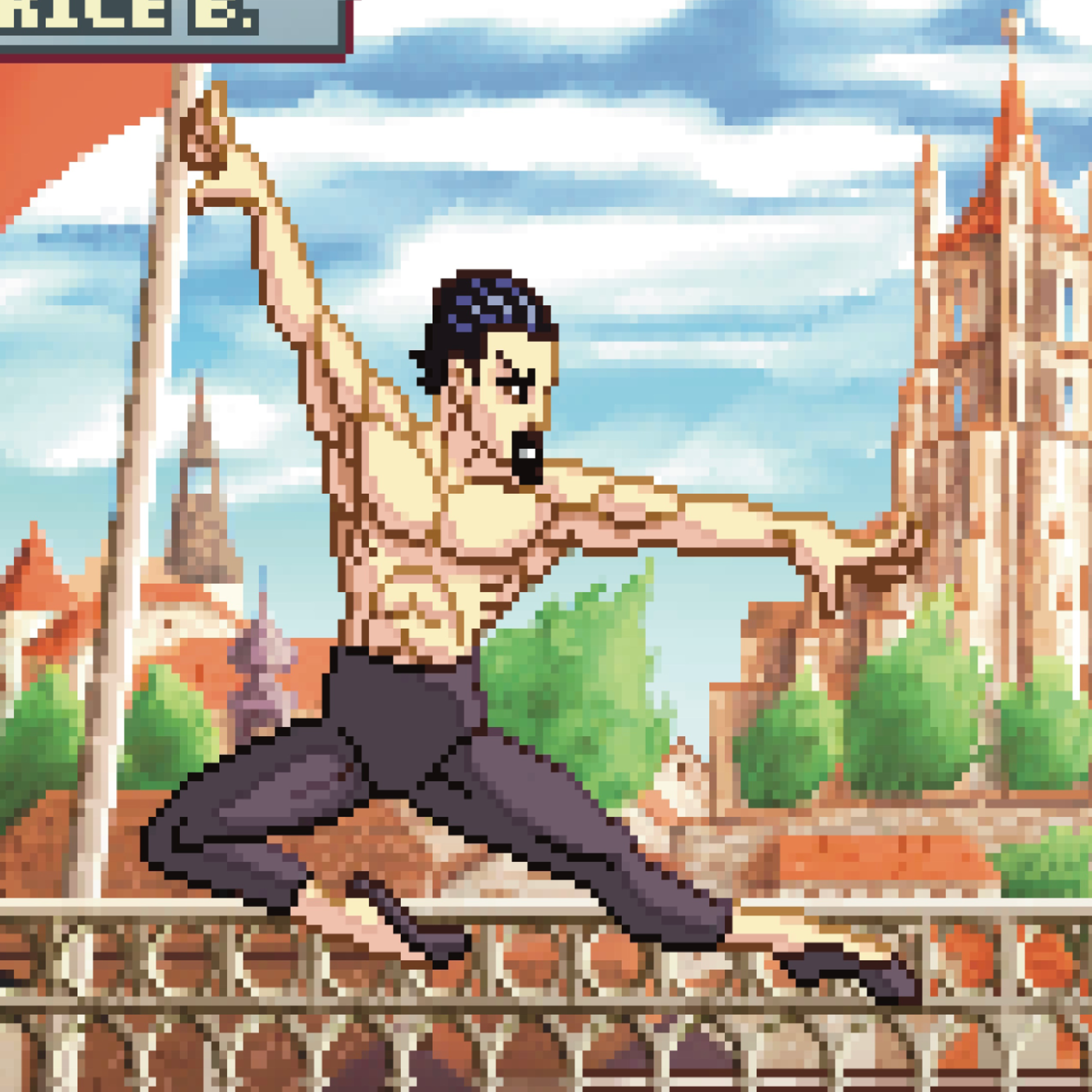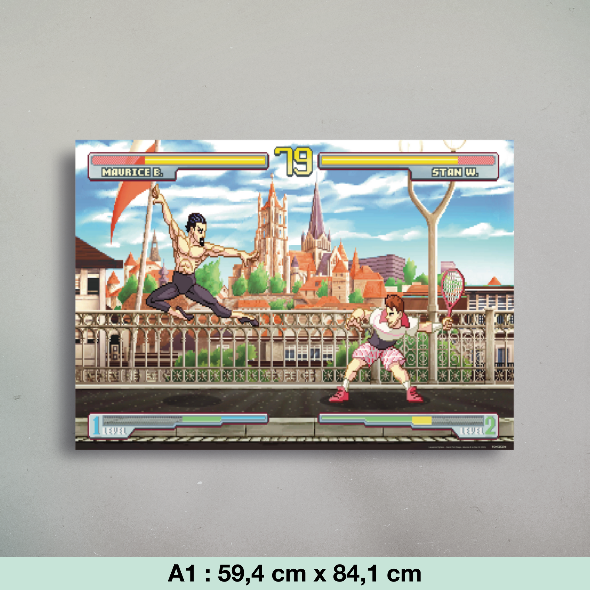 Pixel art inspiré des jeux de combat rétro façon Street Fighter. La scène se déroule sur le Grand-Pont de Lausanne, avec en toile de fond la cathédrale avec la vieille ville et ses toits emblématiques. Sur le pont, deux figures lausannoises mythiques s’affrontent : un champion de tennis et un danseur étoile, chacun dans son style, transformant la ville en véritable arène vidéoludique.