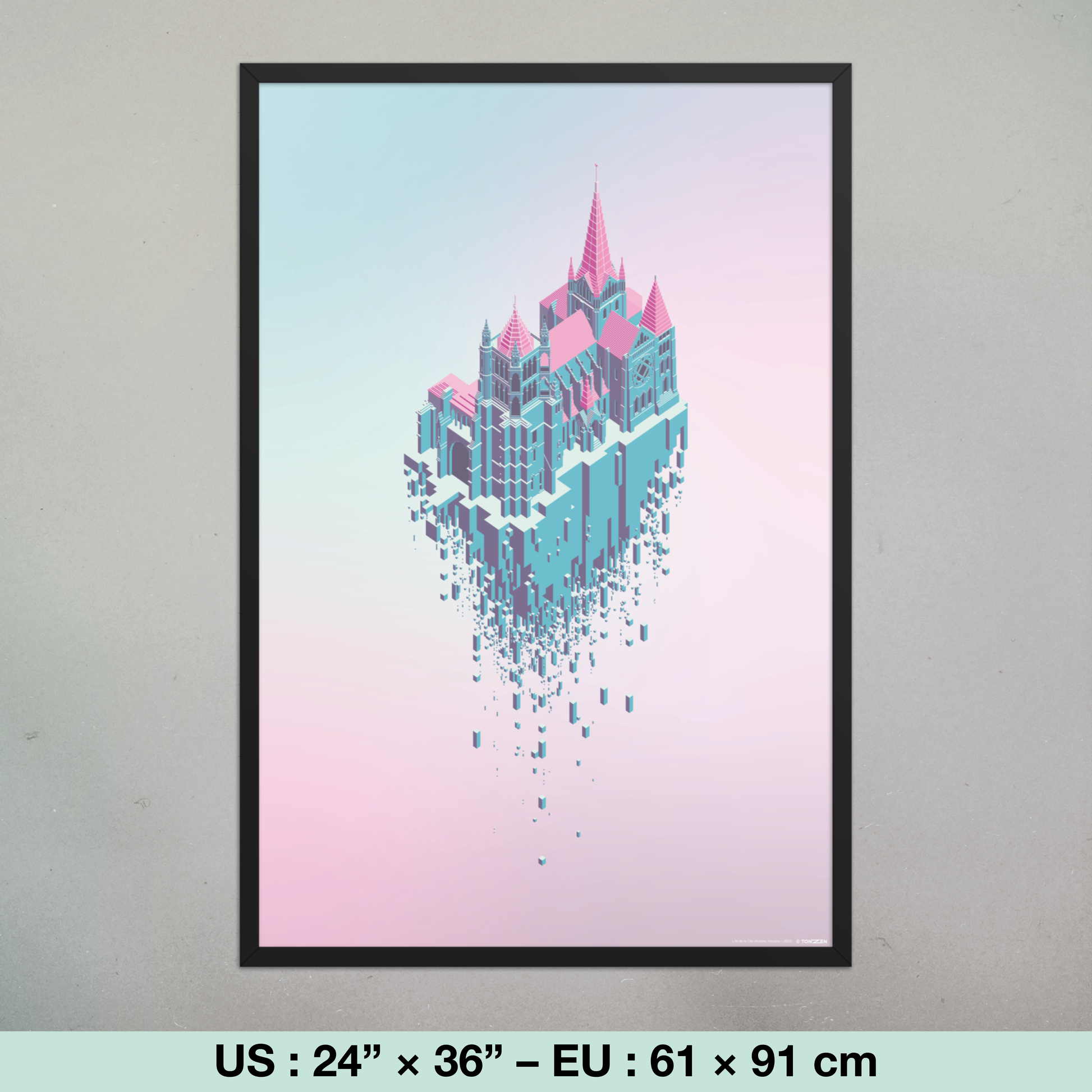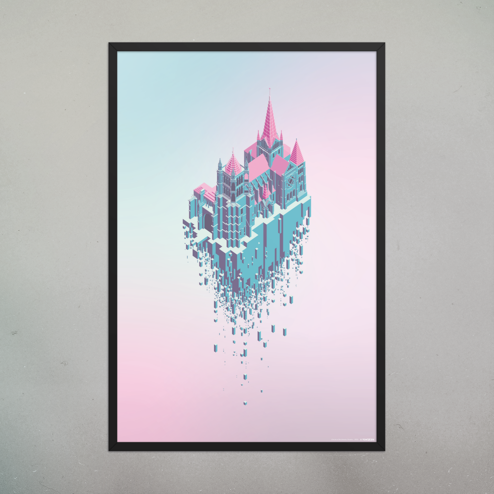 Illustration isométrique de la cathédrale de Lausanne, entièrement construite à partir de milliers de petits cubes. Posée sur une île flottante qui semble se désagréger dans le vide, l’architecture et le sol se confondent en un seul bloc fragmenté. Les tons doux, dominés par des nuances de magenta et de turquoise, apportent une atmosphère onirique et légère.