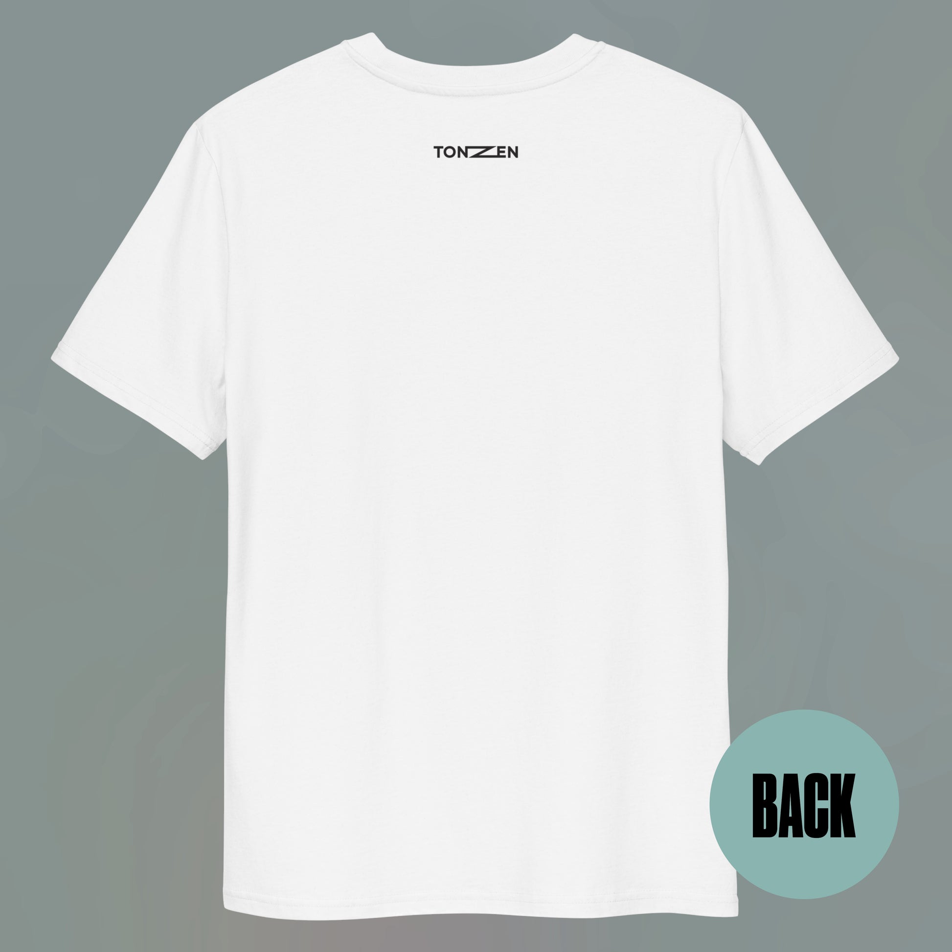Illustration et typographie handmade, version basique en noir sur tissu blanc. Logo Tonzen au dos.